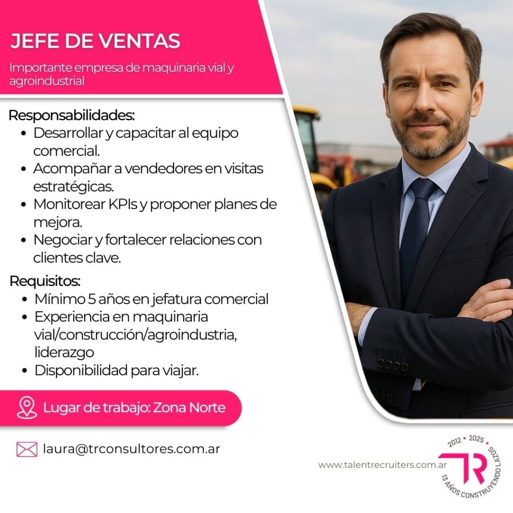 Importante empresa de maquinaria vial y agroindustrail busca un Jefe de Ventas para liderar la gestión integral de la sucursal, asegurando el cumplimiento de objetivos comerciales, operativos y de servicio.